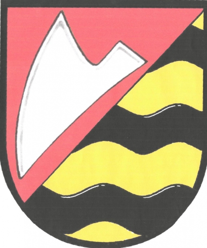V červeno - zlatě šikmo děleném štítě vpravo šikmá stříbrná radlice, vlevo tři černá vlnitá břevna.